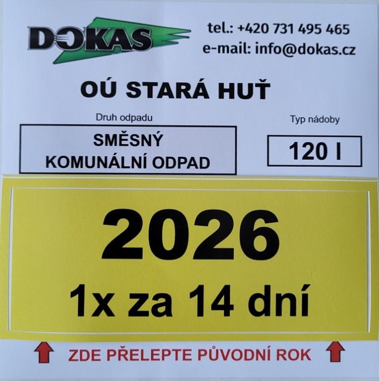 Známky na popelnice na rok 2026 budou k prodeji od 5.1.2026, během ledna 2026 jsou stále v platnosti známky loňské. 4.2.2026, kdy pobíhají oba svozy, musí být všechny popelnice opatřeny novými známkami. Připomínáme, že se mění pouze známka označená rokem, podkladová s označením obce zůstává.